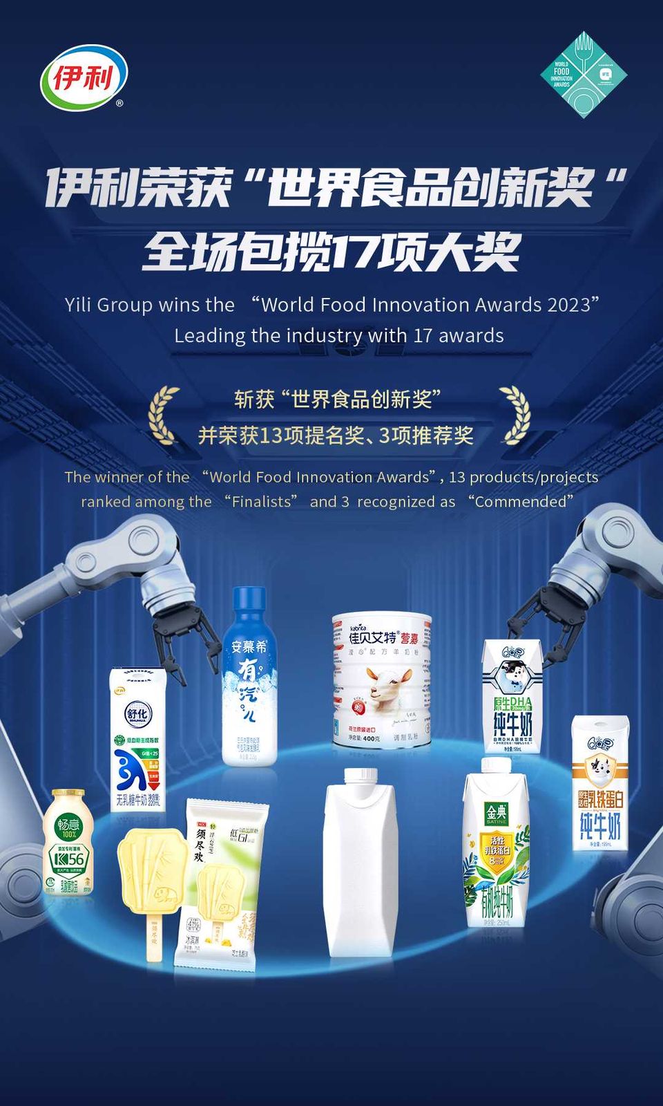 獲得“匠心產品”推薦獎的金典活性乳鐵蛋白有機純牛奶,應用創新性的先進技術保持乳鐵蛋白原生活性特征,以更多活性乳鐵蛋白幫助提升人體自護力,是全球首款常溫活性乳鐵蛋白有機純牛奶。在“食品創新”、“乳制品創新”類別榮獲2項提名獎的安慕希有汽兒酸奶,是行業首款常溫氣泡酸奶,創新酸奶充氣工藝,為酸奶帶來融合氣泡飲品的獨特體驗。榮獲“匠心產品”、“乳制品創新”2項提名獎的QQ星原生DHA純牛奶,以專利技術科學飼養奶牛,奶牛產奶自帶DHA,為兒童帶來更多專屬營養。獲得“冰鮮/冷凍產品創新”提名獎的須盡歡芝士乳酪味冰淇淋,在配方中添加膳食纖維,是中國首款綠色聯盟低GI食品認證的低GI冰淇淋產品。獲得“乳制品創新”提名獎的佳貝艾特營嘉瀅心配方羊奶粉,創新性地將植物甾醇脂、葉酸、牛磺酸以及鋅等元素進行科學配比,更好呵護中老年人群心腦血管健康。此外,QQ星原生活性乳鐵蛋白純牛奶在“技術創新”、“兒童/嬰兒產品創新”、“匠心產品”類別榮獲3項提名獎;舒化控糖牛奶在“技術創新”、“乳制品創新”類別榮獲2項提名獎;暢意100%乳酸菌飲品榮獲“飲品創新”提名獎;安慕希虎起中國范春節營銷活動、安慕希公益環保活動、安慕希地域限定助力鄉村振興榮獲“市場營銷創新”推薦獎和提名獎。