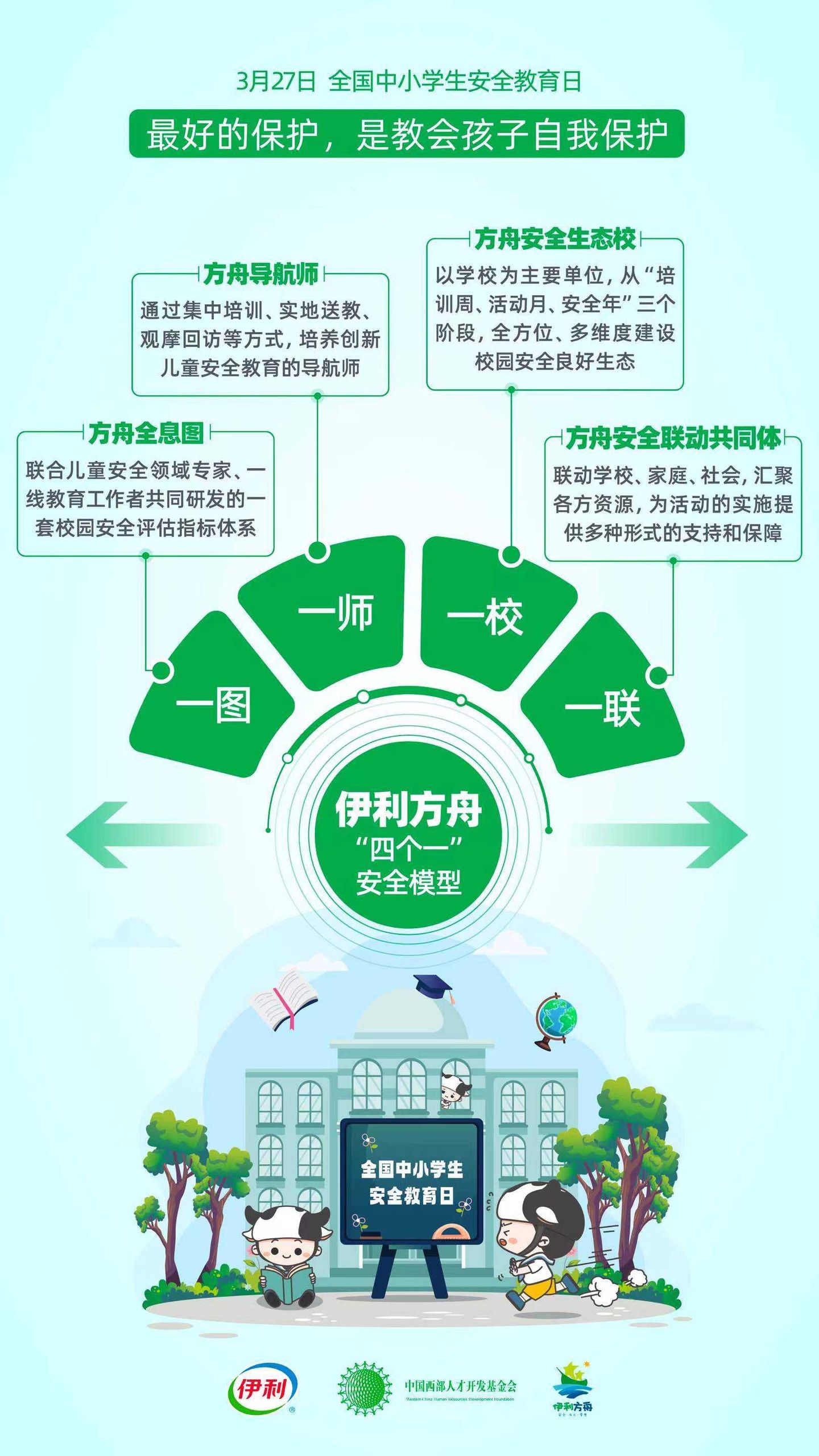 地震、火災、溺水、校園霸凌、網絡暴力……兒童安全涉及的內容太多、太廣、太細,“伊利方舟”結合這些安全議題的研究和實踐,正式推出“四個一”安全模型:一圖——方舟全息圖(即《伊利方舟全息圖》)、一師——方舟導航師、一校——方舟安全生態校、一聯——方舟安全聯動共同體。