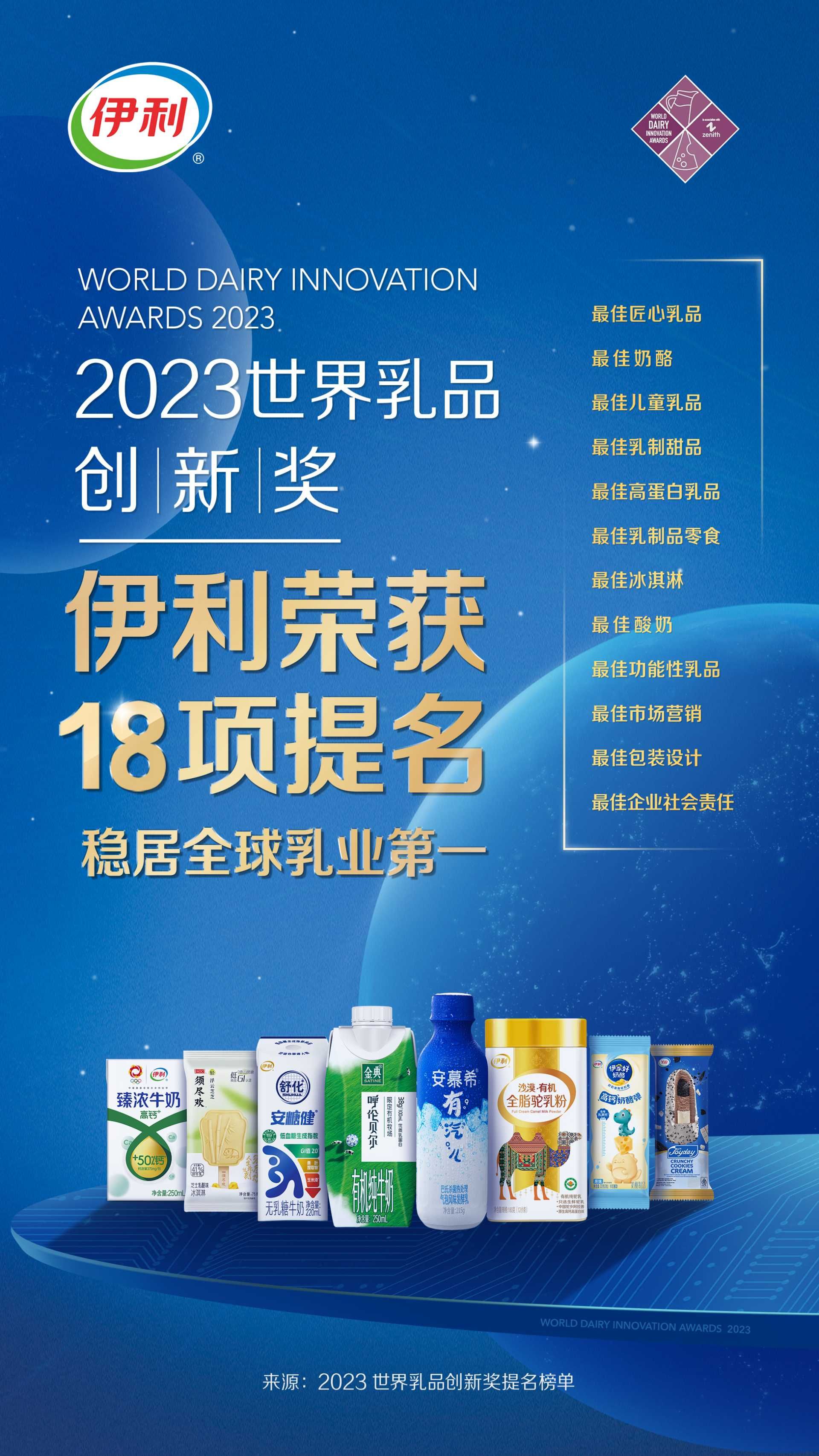 6月8日,2023年世界乳品創新獎(World Dairy Innovation Awards)最終提名名單面向全球正式發布。憑借在創新領域的卓越表現,伊利榮獲最佳匠心乳品、最佳奶酪、最佳兒童乳品、最佳乳制甜品、最佳高蛋白乳品、最佳乳制品零食、最佳冰淇淋、最佳酸奶、最佳功能性乳品、最佳市場營銷、最佳包裝設計和最佳企業社會責任/可持續發展倡議12個類別獎項的18項提名,獲提名數量持續提升,再創歷史新高,成為全球獲提名最多的乳制品企業,標志著伊利創新實力獲得全球行業高度認可。